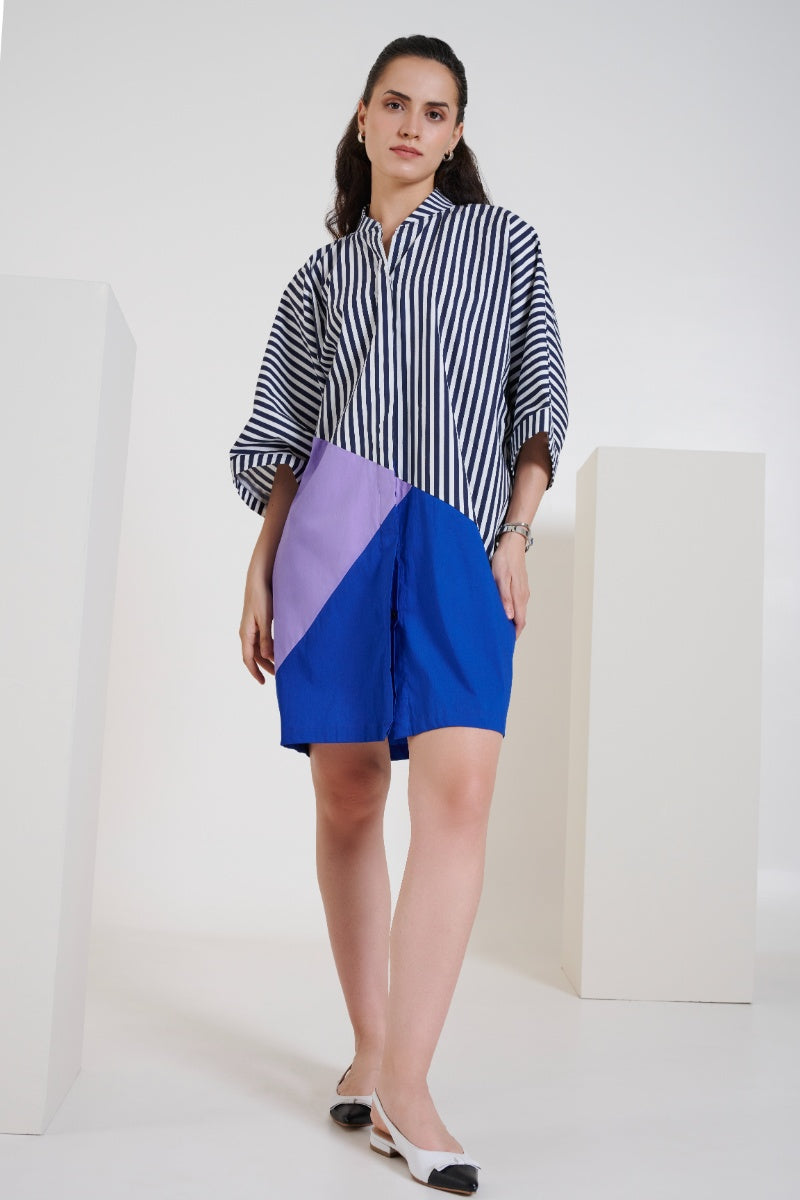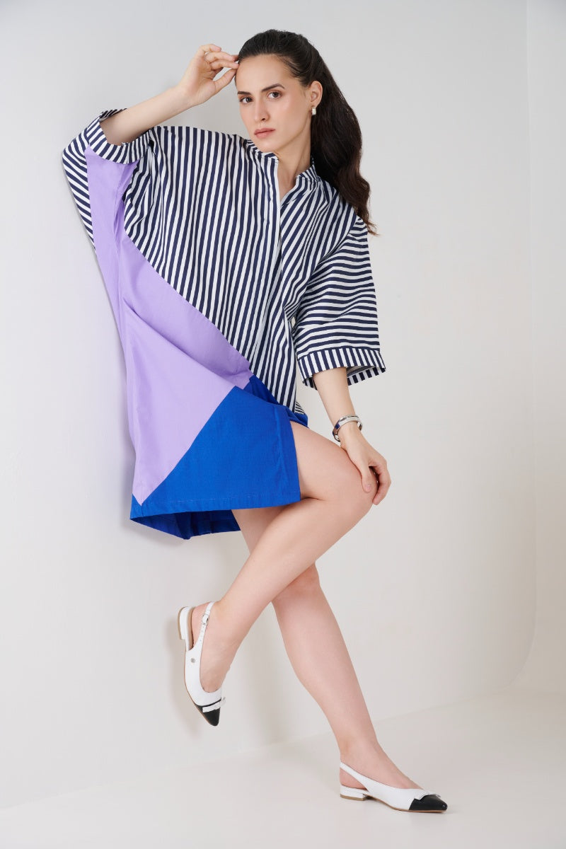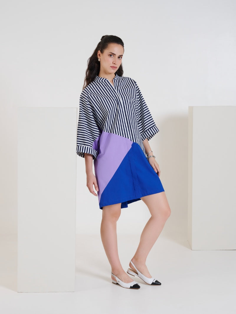 This knee length dress, designed to celebrate color, structure, and comfort. Crafted with three distinct color panels interspersed with classic stripes, the dress creates a visually engaging composition that is both fun and fashion-forward. The thoughtful color blocking adds vibrancy and movement to the garment, making it an instant statement piece while keeping the design approachable and wearable.